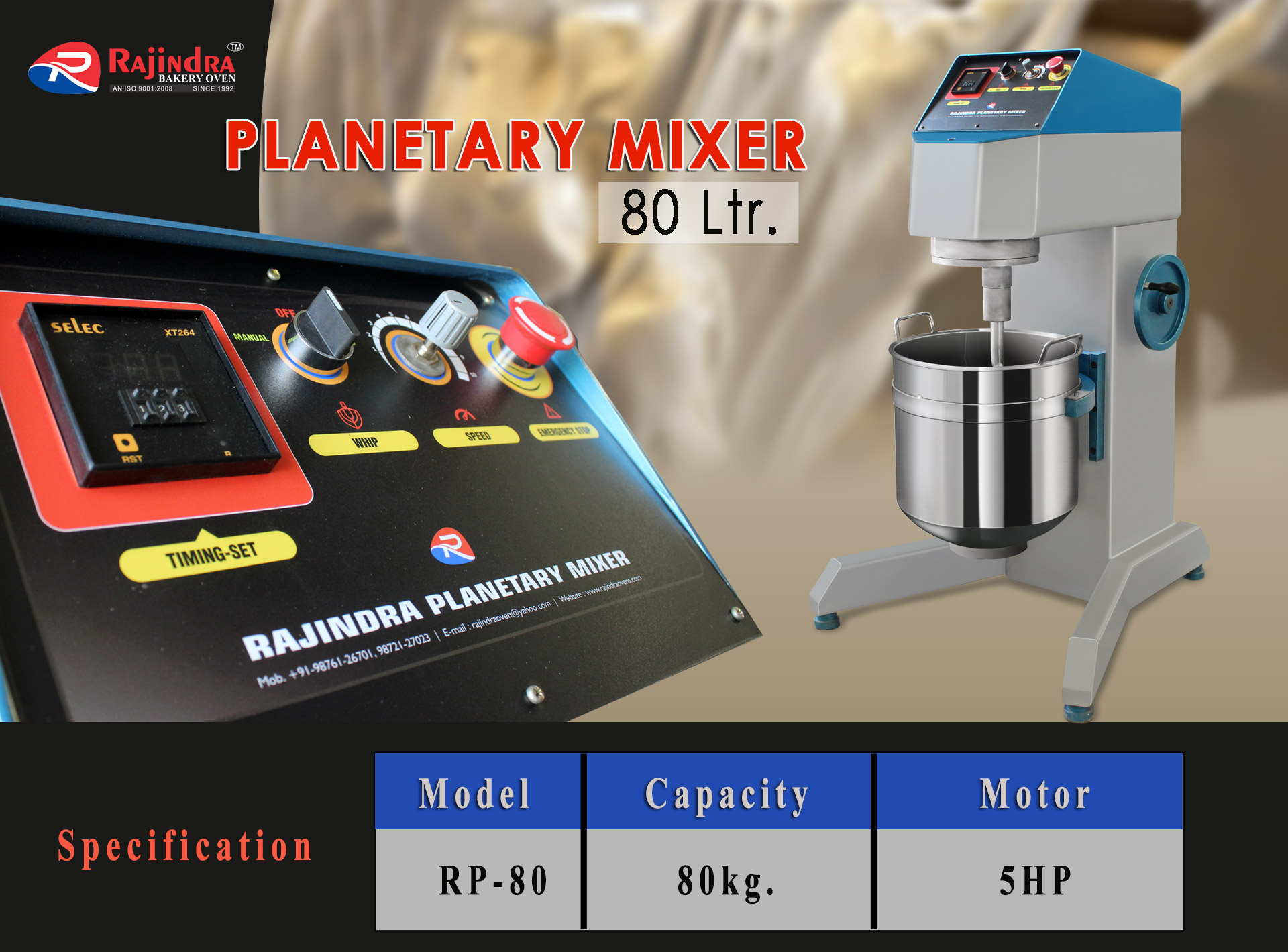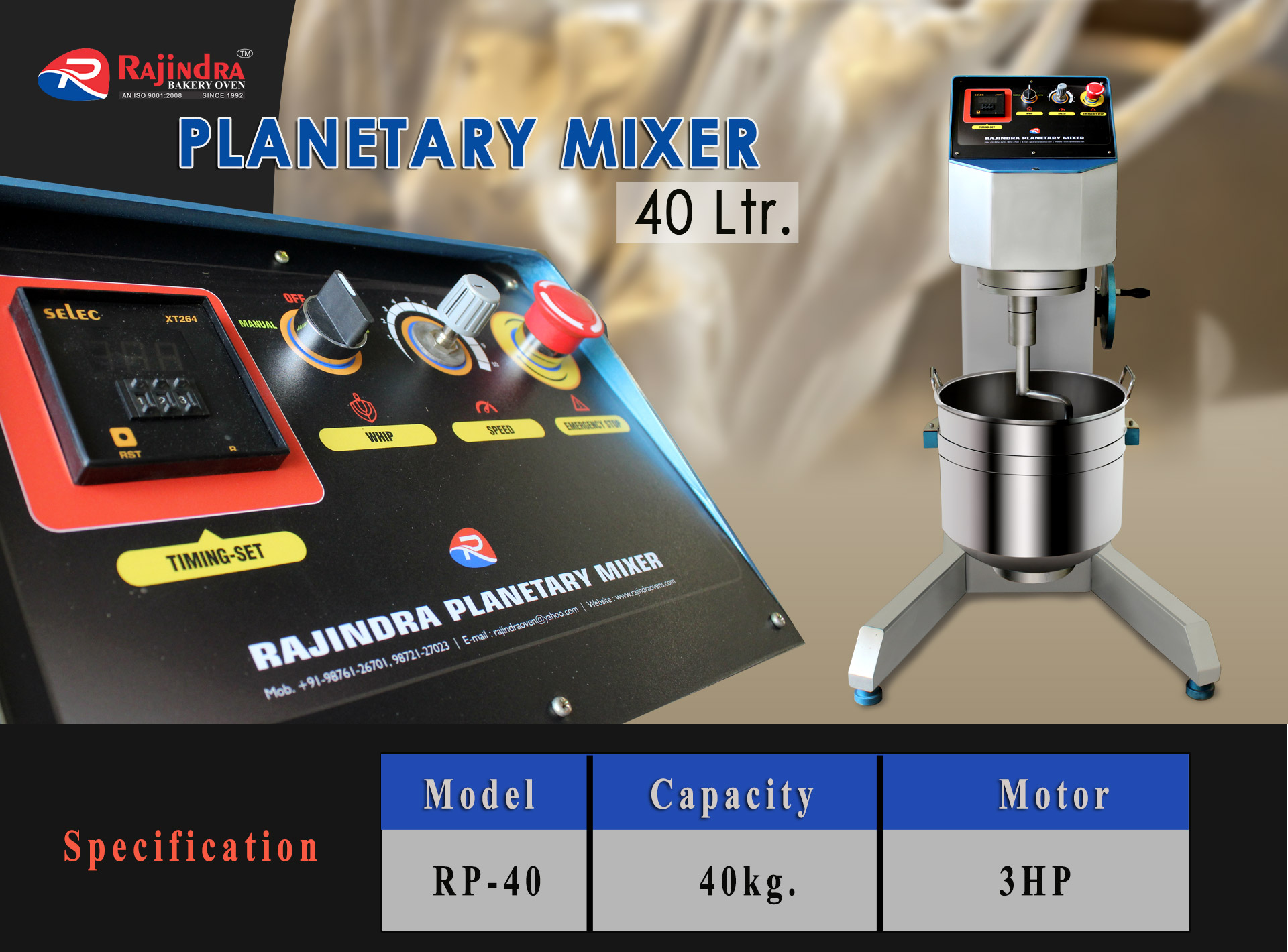 This type of planetary mixer features a fixed, non-rotating bowl. The bowl is latched onto the base of the planetary mixermachine and can be raised into the mixing position. Machine size is determined by the available mixing bowl volume, usually measured in quarts. We Have generally Planetary Mixer comes in 40, 80 and 140 liters. Many of these machines also come with variable speed options to accommodate different mixing needs.